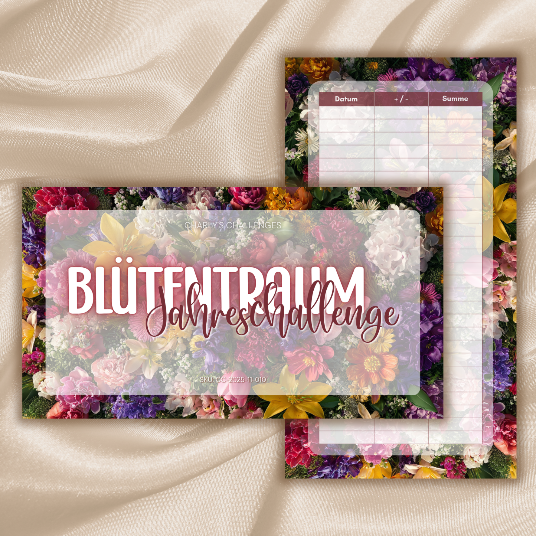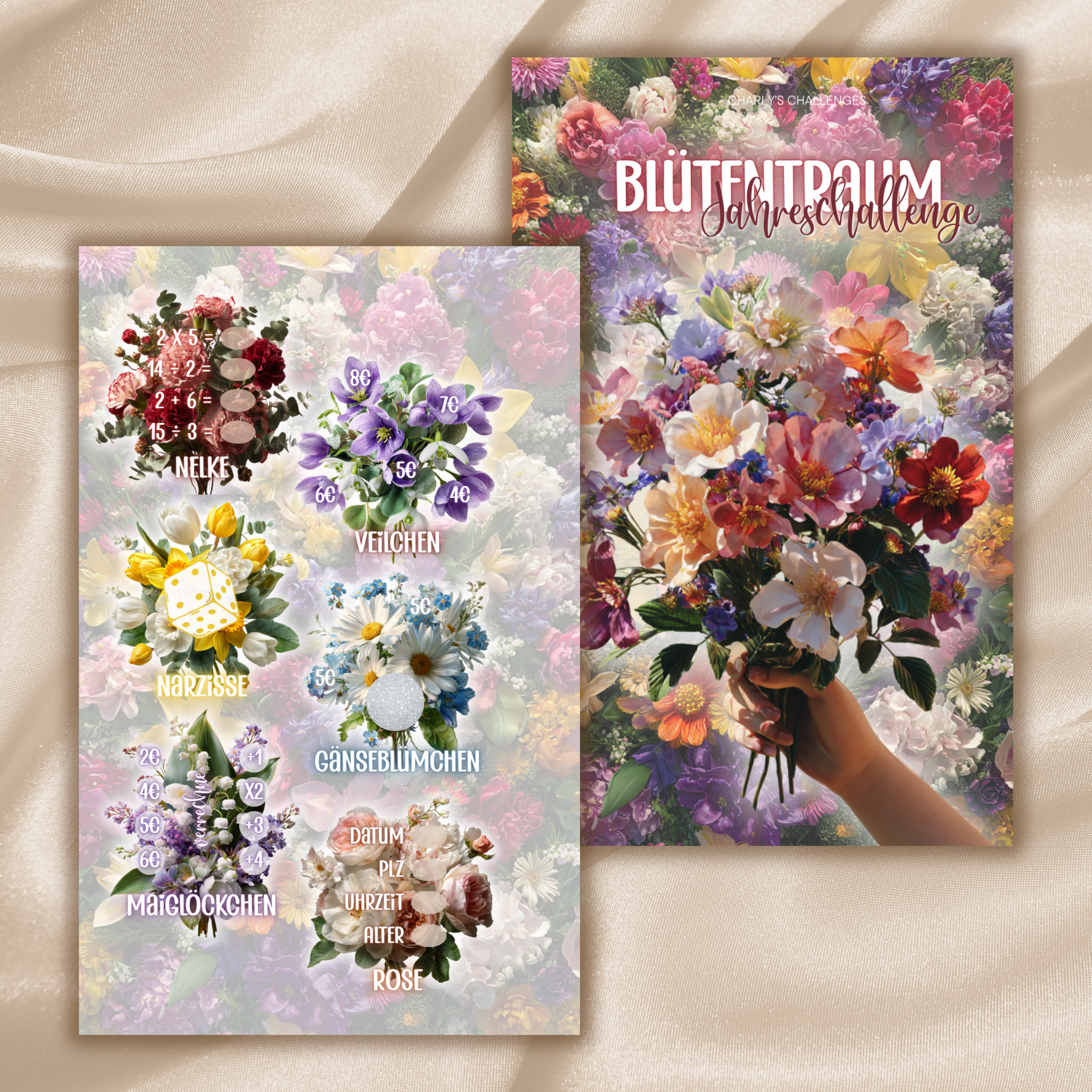 Bei der Blütentraum Jahreschallenge erwartet dich jeden Monat eine neue, passende Blume – begleitet von abwechslungsreichen Aufgaben, die dich durchs Jahr führen und dein Sparziel Schritt für Schritt wachsen lassen.