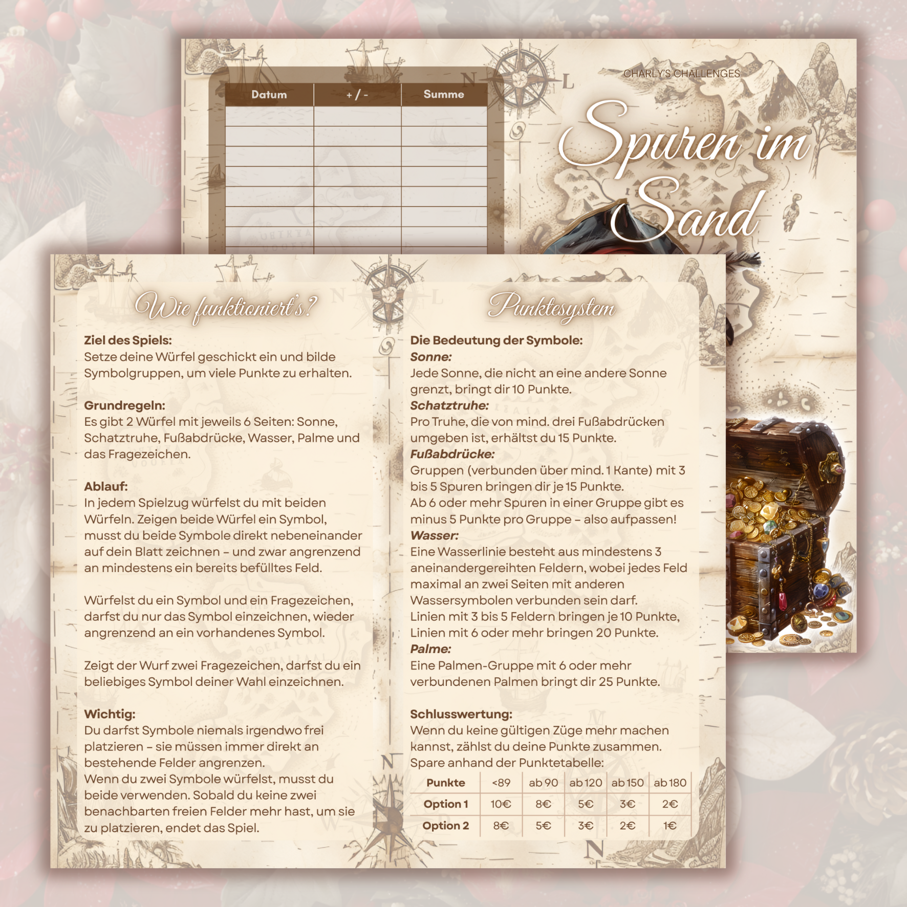 Spuren im Sand“ ist ein spielerisches Sparerlebnis, bei dem du mit jedem Zug neue Spuren setzt. Pro Runde würfelst du mit den 2 extra angefertigten Würfeln und füllst das Spielfeld taktisch aus. Wer geschickt setzt, sammelt viele Punkte – und je mehr Punkte, desto kleiner dein Sparbetrag. ✨