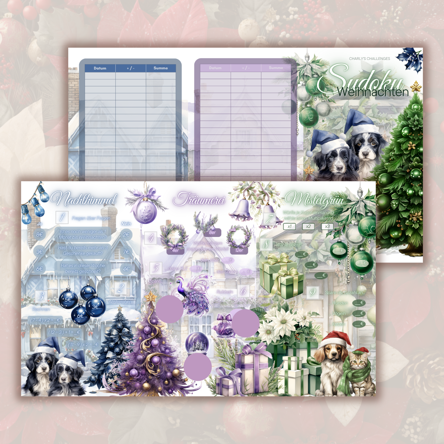 Zu jeder eingetragenen Zahl gehört eine passende Aufgabe in der Klappkarte, die du anschließend erledigst – mal sparst du einen Betrag, mal erwartet dich eine kleine Aktion. 🎲🎅