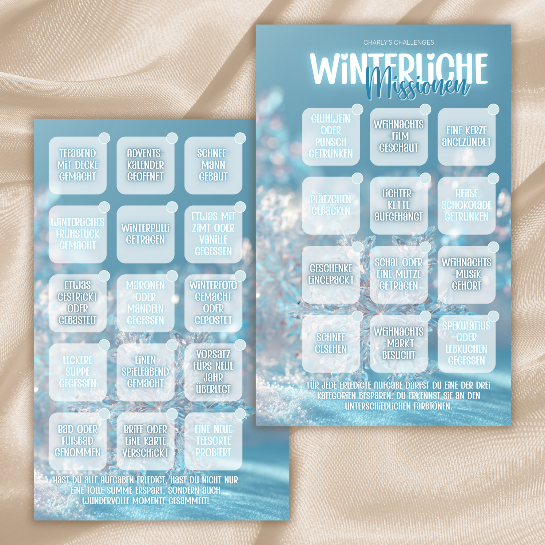 Winterliche Missionen ist ein Sparbundle mit verschiedenen kleinen Aufgaben und Fragen rund um die Winterzeit. Zum Beispiel: „Hast du dieses Jahr schon Punsch getrunken?“